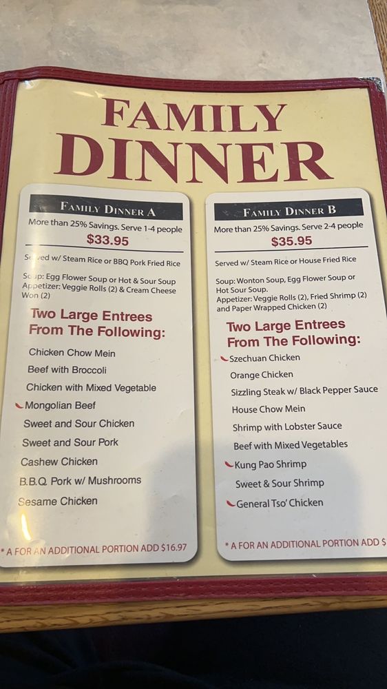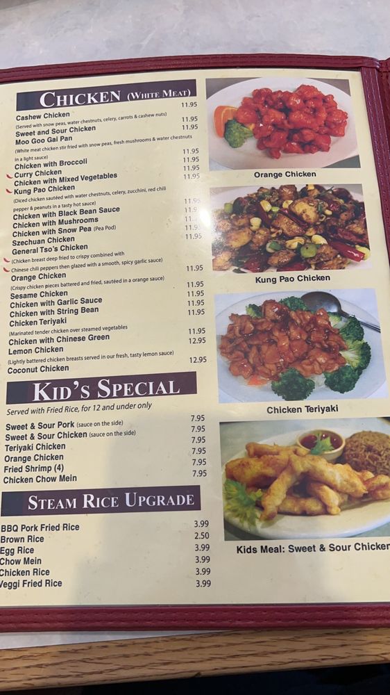 - Appetizers: Begin your meal with favorites like the crispy Fried Cream Cheese Wontons and healthy Chicken Lettuce Cups, packed with chicken and mushrooms.